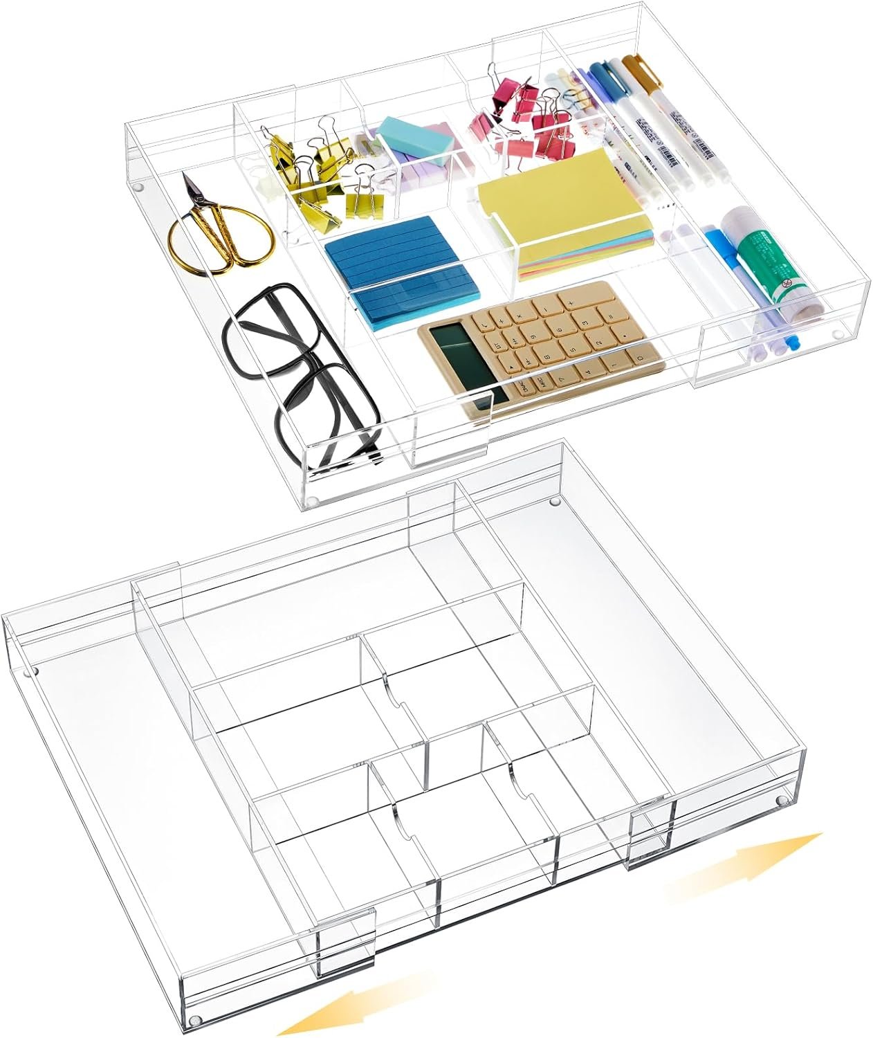 2 Pcs Expandable Desk Drawer Organizer Maximum 12 x 18 Inches Acrylic Drawer Organizer Trays with 8 Adjustable Compartments Desk Accessories for Makeup Silverware Office Bathroom