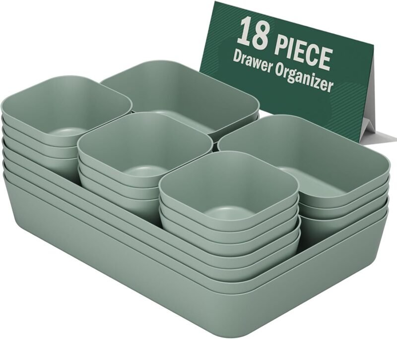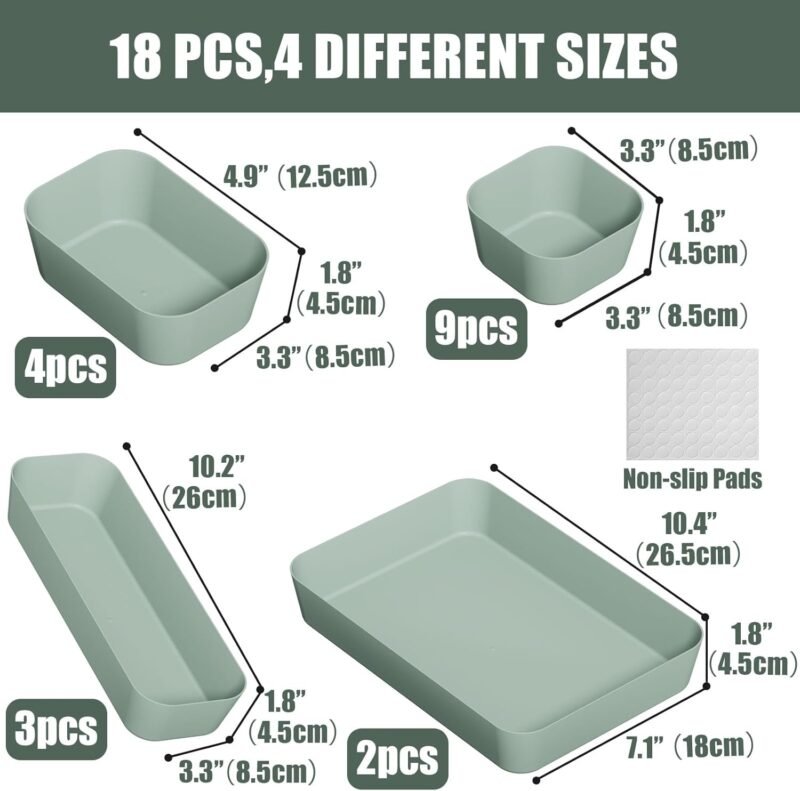 Plastic Drawer Organizers, 18 PCS Drawer Organizer Bins, Bathroom and Vanity Organizer Plastic Tray, Makeup organizer and storage for Makeup, Bedroom, Kitchen Gadgets Utensils and Office (Green)